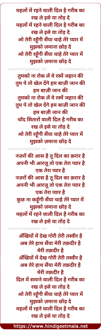 Lyrics of Mahalo Me Rahane Vaalee Dil Hai Garib Kaa - महलों में रहने वाली दिल है गरीब का