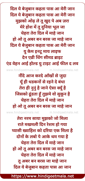 Lyrics of Mahe Jaan, Chehra Tera Dil Me Mahe Jaan - माहे जान, चेहरा तेरा दिल में माहे जान