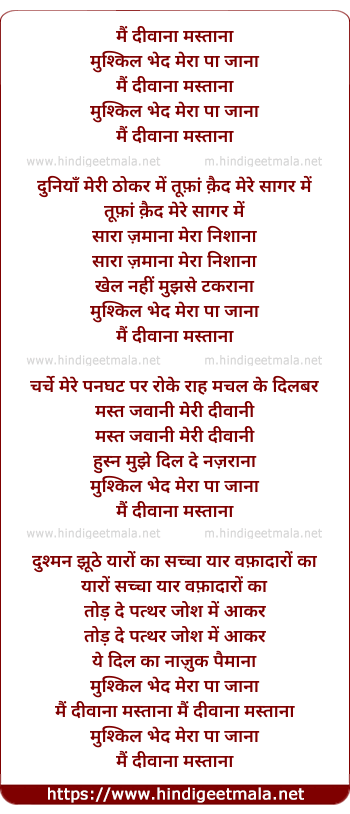 Lyrics of Mai Divana Mastana, Mushkil Bhed Mera Pa Jana - मैं दीवाना मस्ताना,मुश्किल भेद मेरा पा जाना