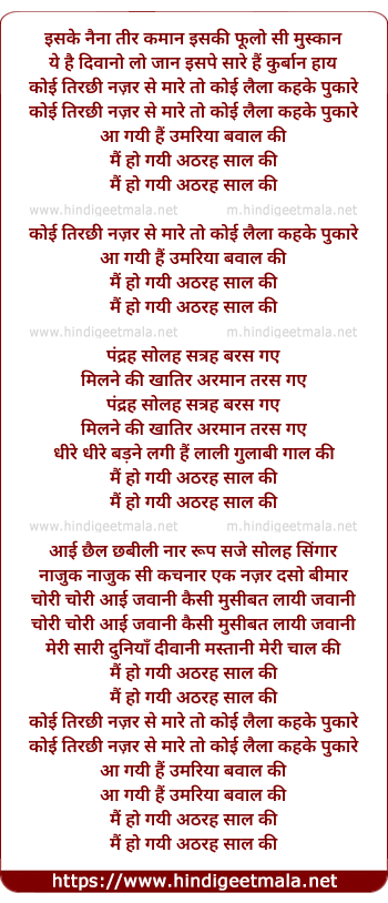 Lyrics of Mai Ho Gayi Athara Saal Ki - मैं हो गयी अठारह साल की