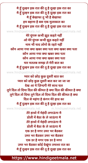 Lyrics of Mai Hu Dulhan Ek Raat Ki - मै हूँ दुल्हन इक रात की