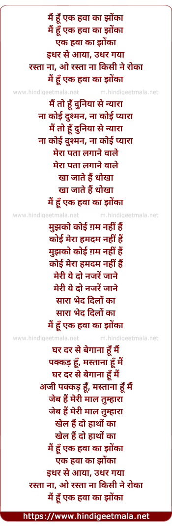 Lyrics of Mai Hu Ek Hawa Ka Jhonka - मैं हूँ एक हवा का झोंका