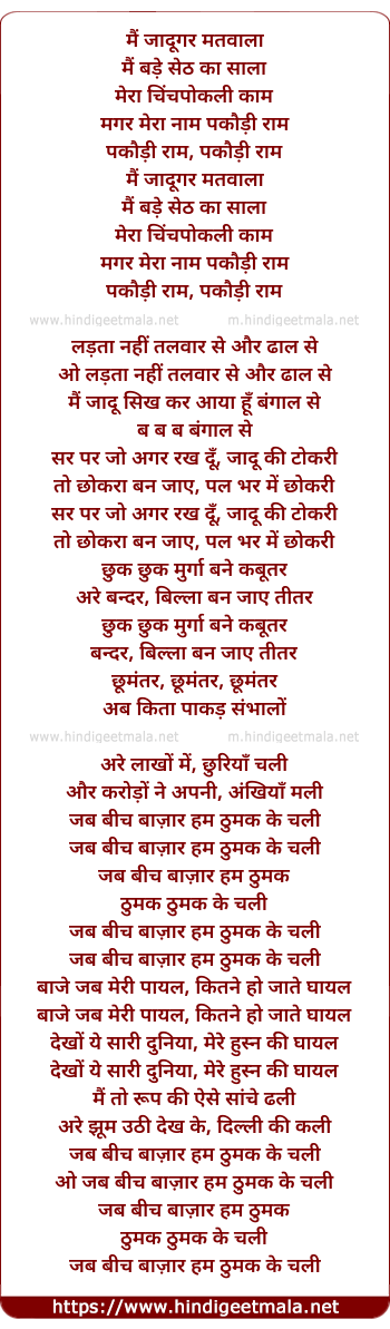 Lyrics of Mai Jadugar Matwala - मैं जादूगर मतवाला