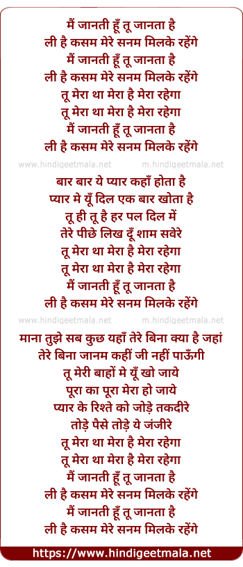 Lyrics of Mai Janti Hu Tu Janta Hai - मैं जानती हूँ तू जानता है