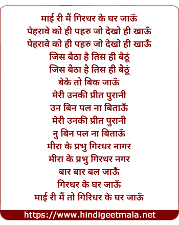 Lyrics of Mai Ri Main To Giridhar Ke Ghar Jaoon - माई री मैं गिरधर के घर जाऊँ