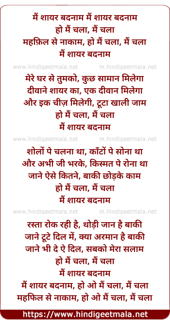 Lyrics of Mai Shayar Badnaam Ho Main Chala - मैं शायर बदनाम हो मैं चला