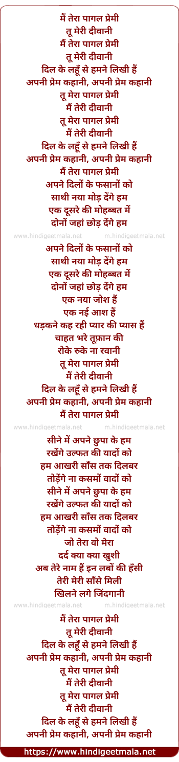 Lyrics of Mai Tera Pagal Premi Tu Meri Diwani - मैं तेरा पागल प्रेमी तू मेरी दीवानी