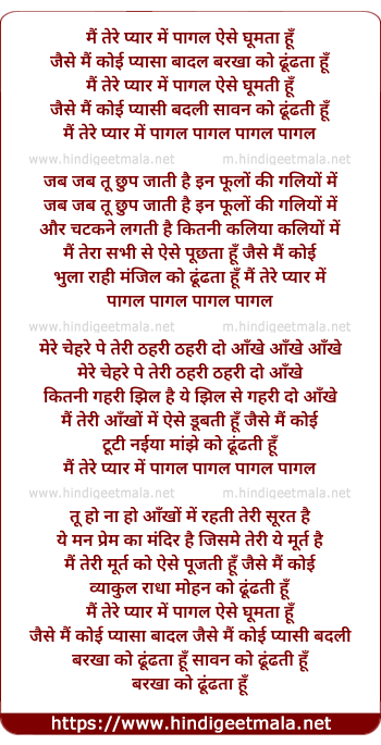 Lyrics of Mai Tere Pyar Me Pagal Aise Gumta Hu - मैं तेरे प्यार में पागल ऐसे घूमता हूँ