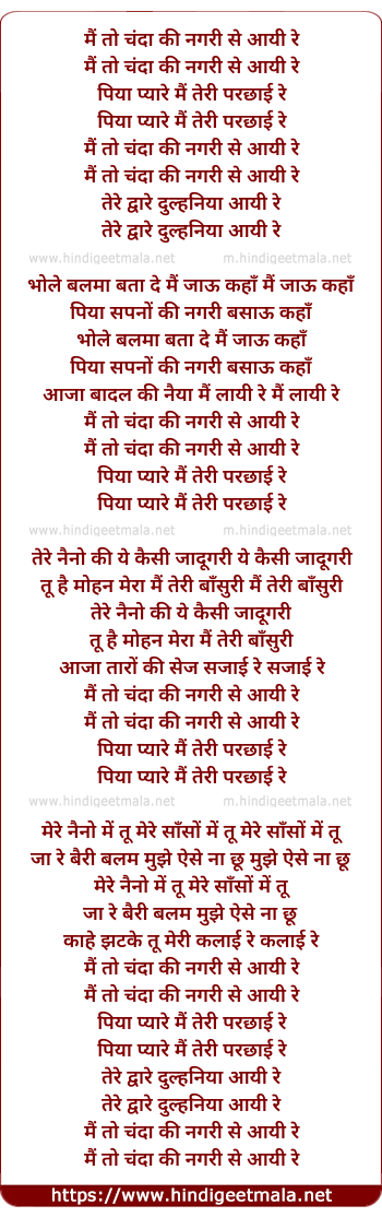 Lyrics of Mai To Chanda Ki Nagri Se Aayi Re - मैं तो चंदा की नगरी से आयी रे