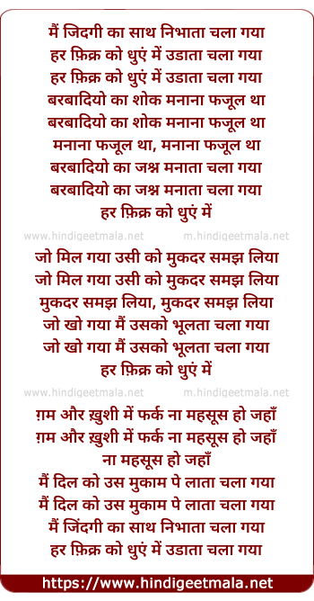 Lyrics of Mai Zindagi Ka Sath Nibhata Chala - मैं जिदगी का साथ निभाता चला गया