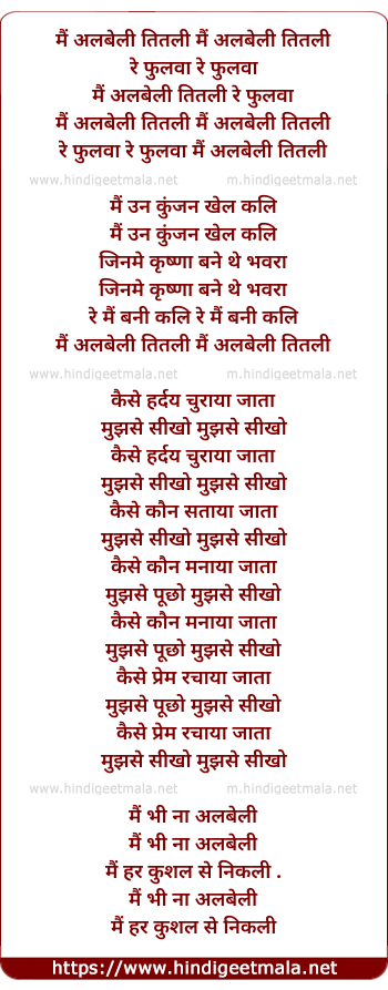 Lyrics of Main Albeli Titli Re Phulwa - मैं अलबेली तितली मैं अलबेली तितली
