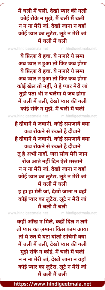 Lyrics of Main Chali Main Chali, Dekho Pyaar Ki Gali - मैं चली मैं चली, देखो प्यार की गली