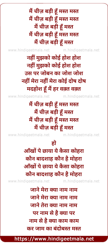Lyrics of Main Cheez Badi Hoon Mast Mast - मैं चीज़ बड़ी हूँ मस्त मस्त