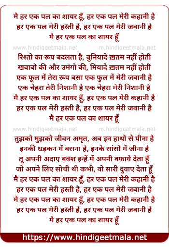Lyrics of Main Har Ek Pal Kaa Shayar Hu - मैं हर एक पल का शायर हूँ