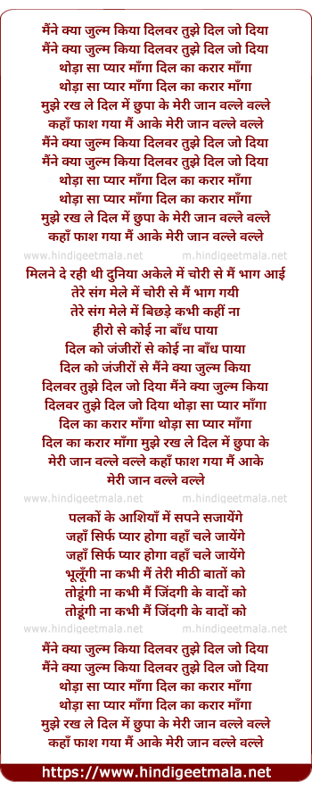 Lyrics of Maine Kya Jhulm Kiya Dilbar Tujhe Dil Jo Diya - मैंने क्या जुल्म किया दिलबर तुझे दिल जो दिया