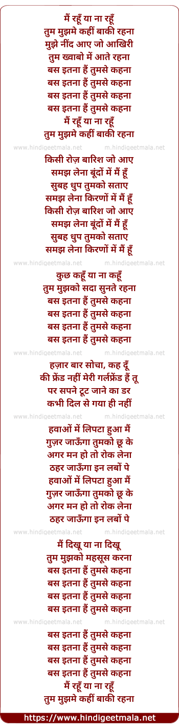Lyrics of Main Rahoon Ya Naa Rahoon - मैं रहूँ या ना रहूँ