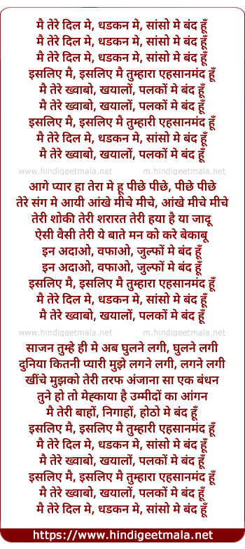 Lyrics of Main Tere Dil Me Dhadkan Me Saanson Me Band Hu - मै तेरे दिल मे, धडकन मे, सांसो मे बंद हूँ