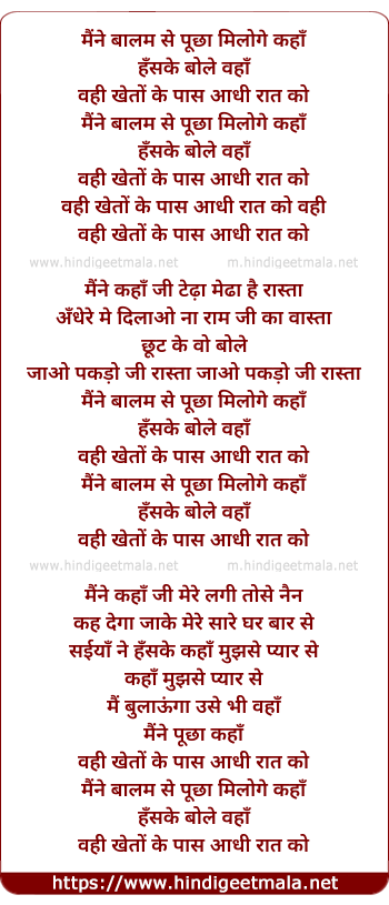 Lyrics of Maine Baalam Se Pucha Miloge Kahaa - मैंने बालम से पूछा मिलोगे कहाँ