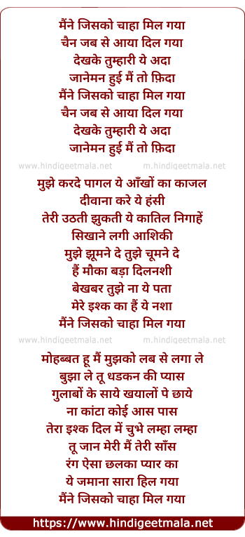 Lyrics of Maine Jisko Chaha Mil Gaya - मैंने जिसको चाहा मिल गया
