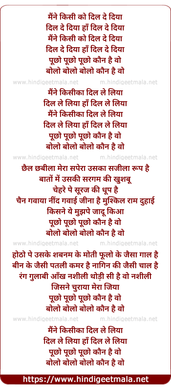 Lyrics of Maine Kisi Ko Dil De Diyaa, Puchho Kaun Hai Vo - मैंने किसी को दिल दे दिया, पूछो कौन है वो