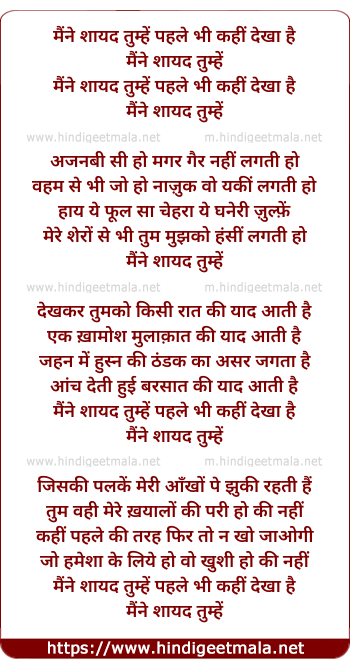 Lyrics of Maine Shaayad Tumhe, Pahle Bhi Kahi Dekha Hai - मैंने शायद तुम्हें पहले भी कहीं देखा है