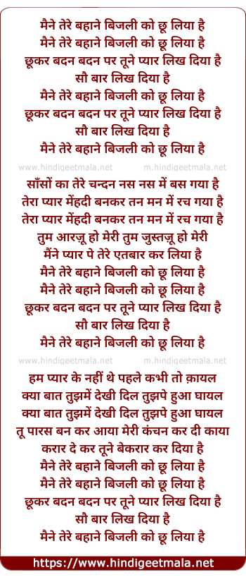 Lyrics of Maine Tere Bahane Bijli Ko Chu Liya Hai - मैने तेरे बहाने बिजली को छू लिया है