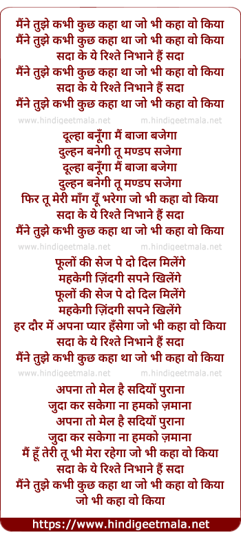 Lyrics of Maine Tujhe Kabhie Kuch Kaha Tha Jo Bhi Kha Wo Kiya - मैंने तुझे कभी कुछ कहा था जो भी कहा वो किया