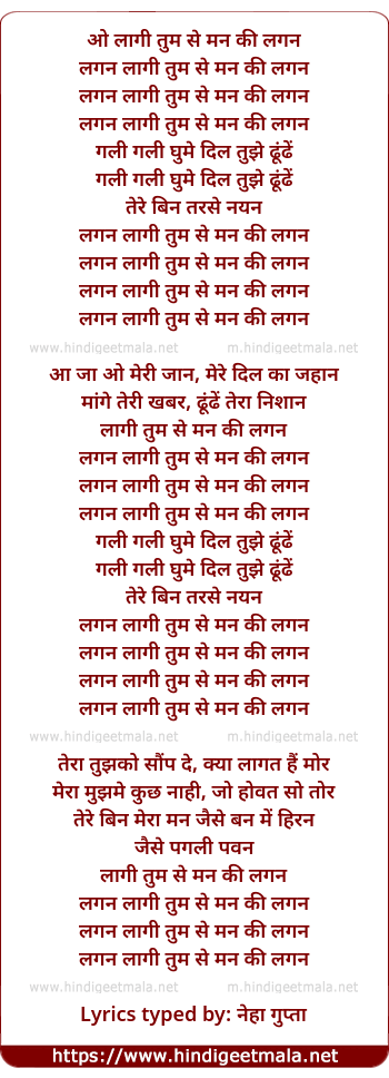 Lyrics of O Laagi Tum Se Man Ki Lagan - ओ लागी तुम से मन की लगन