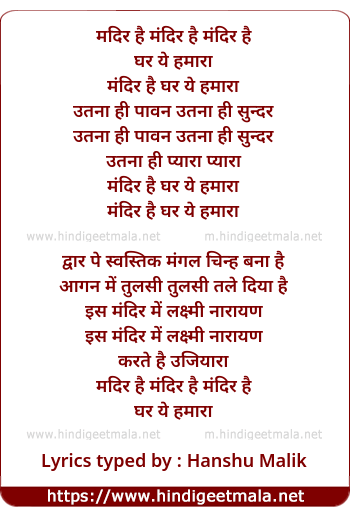 Lyrics of Mandir Hai Ghar Yeh Hamaara - मंदिर है घर ये हमारा