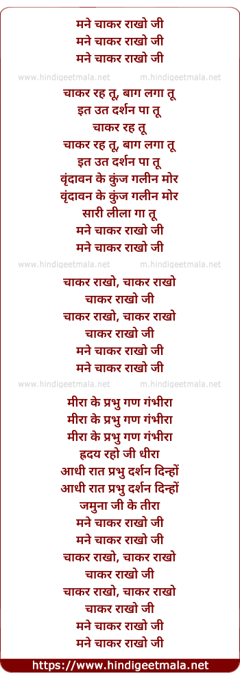 Lyrics of Mane Chakar Rakho Ji - मने चाकर राखो जी