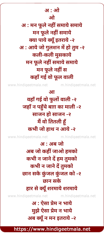 Lyrics of Mann Phulo Nahi Samaye - अ : ओ