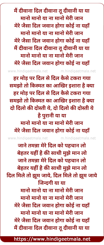 Lyrics of Mano Mano Ya Naa Mano Meree Jan - मानो मानो या ना मनो मेरी जान