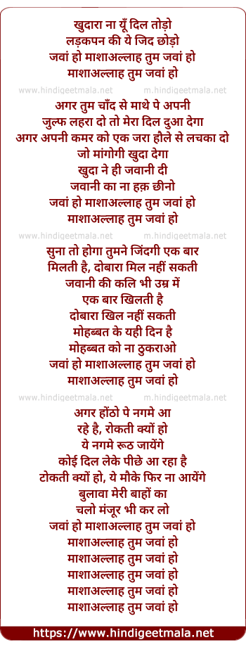 Lyrics of Mashalla Tum - माशाअल्लाह तुम
