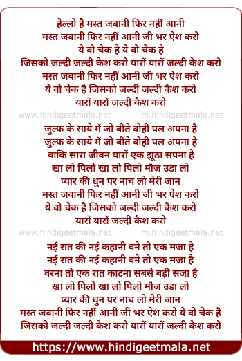 Lyrics of Mast Jawani Phir Nahi Aani - मस्त जवानी फिर नहीं आनी
