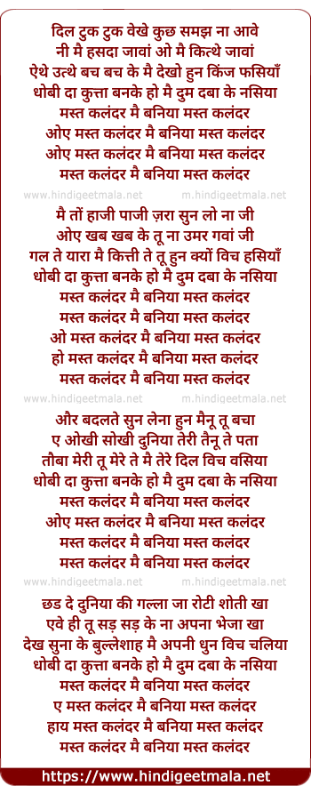Lyrics of Mast Kalander - Remix - दिल टुक टुक वेखे कुछ समझ ना आवे