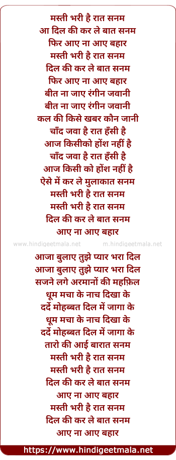 Lyrics of Masti Bhari Hai Raat Sanam - मस्ती भरी है रात सनम