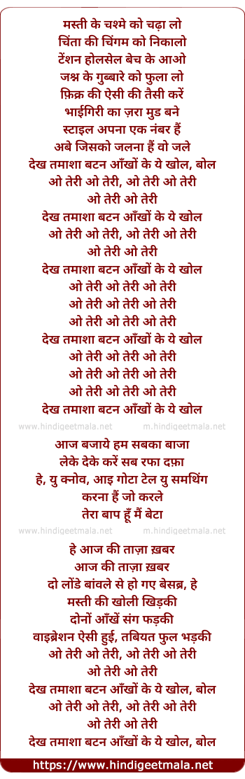 Lyrics of Masti Ke Chasme Ko Chada (O Teri) - मस्ती के चश्मे को चढ़ा लो