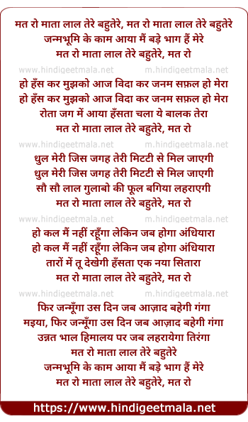 Lyrics of Mat Ro Mata Lal Tere Bahutere - मत रो माता लाल तेरे बहुतेरे