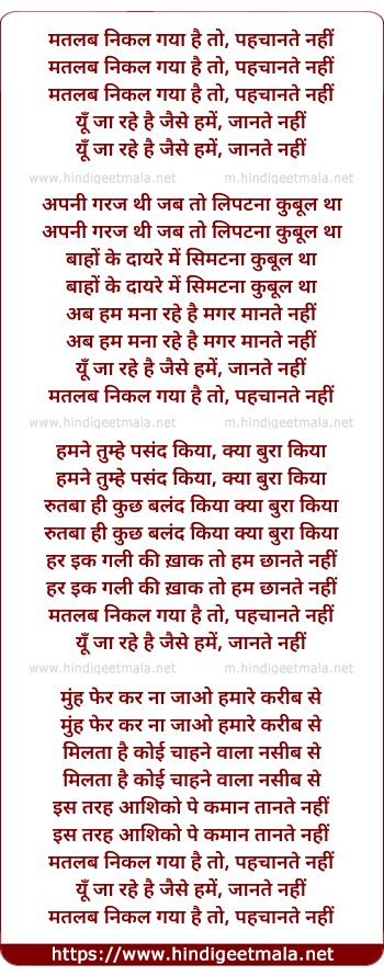 Lyrics of Matalab Nikal Gayaa Hai To Pahachaanate Nahin - मतलब निकल गया है तो पहचानते नहीं