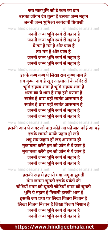 Lyrics of Matrbhumi Jo De Raqt Ka Dan - मातृभूमि जो दे रक्त का दान