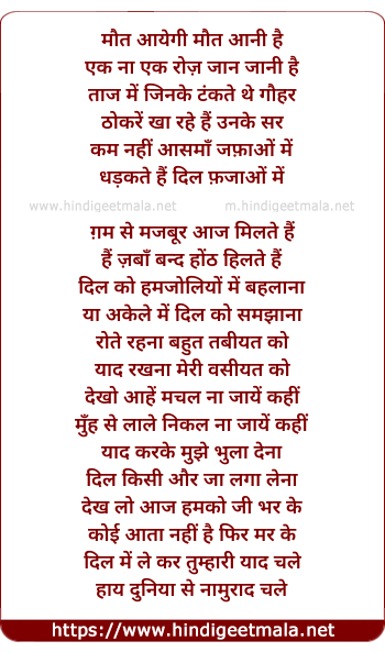 Lyrics of Maut Aayegi Maaut Aani Hai - मौत आयेगी मौत आनी है