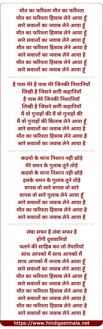 Lyrics of Maut Ka Faristha Hisab Lene Aaya Hu - मौत का फरिश्ता हिसाब लेने आया हूँ