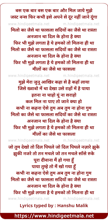 Lyrics of Meelon Ka Jaise Tha Faasala - 1 - बस एक बार बस एक बार और मिल जाये मुझे