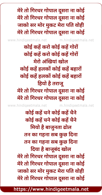 Lyrics of Meera To Giridhar Gopal Dusra Na Koi - मेरे तो गिरधर गोपाल दूसरा ना कोई
