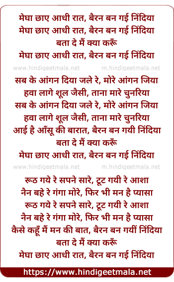 Lyrics of Megha Chhaye Aadhi Raat, Bairan Ban Gai Nindiyaa - मेघा छाए आधी रात, बैरन बन गई निंदिया