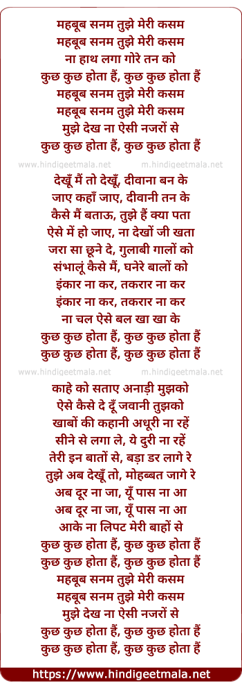 Lyrics of Mehbub Sanam Tujhe Meri Kasam (Kuchh Kuchh Hota Hai) - महबूब सनम तुझे मेरी कसम