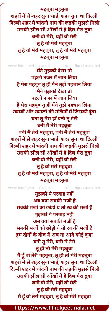 Lyrics of Mehbuba Shehro Me Se Shehar Suna - महबूबा शहरों में से शहर सुना