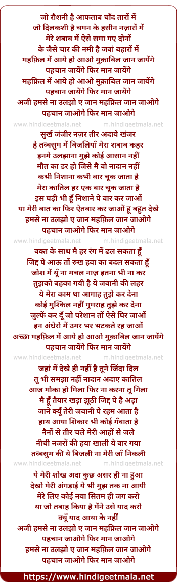 Lyrics of Mehfil Me Aaye Ho Aao Mukabil Jaan Jayenge - महफ़िल में आये हो आओ मुक़ाबिल जान जायेंगे
