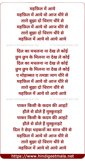 Lyrics of Mehfil Me Aaye Vo Aaj Dhire Se - महफ़िल में आये वो आज धीरे से