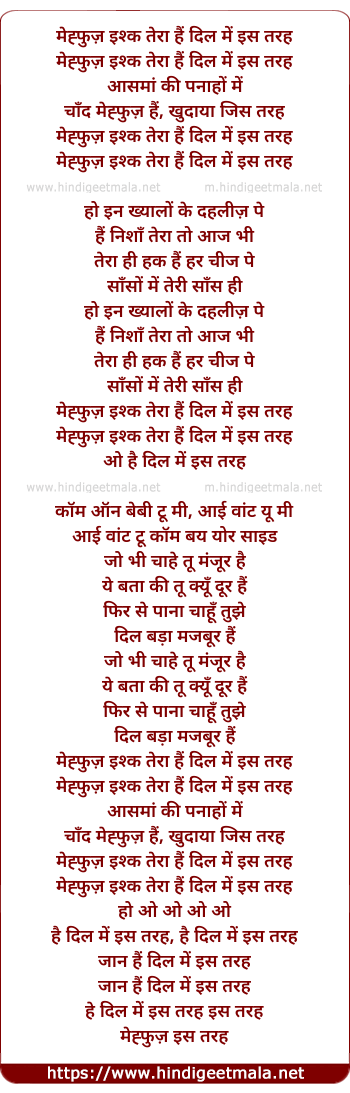 Lyrics of Mehfooz Ishq Tera Hai - मेह्फुज़ इश्क तेरा हैं दिल में इस तरह